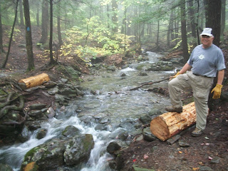 Tuesday 4 intrepid souls, Dave Koerber, Don Fairbanks, Richard Wanderman and I made the long climb up the Race Brook trail to the site of a decayed bridge upstream of the upper falls. For those who might not have seen this bridge, below you see it in better days with Loren Kahn and Dave McCullough making good use of it: